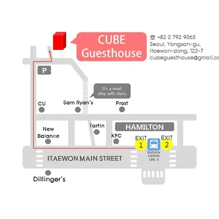 Itaewon semtinde yer alan konukevi, 2 km mesafedeki Seul gibi popüler turistik mekanlara yakındır. Bu otel, Seul şehrinin merkezine 3 km, Gimpo Uluslararasi Havalimani havalimanına arabayla 23 dakika uzaklıktadır. Cube Guesthouse, Leeum Samsung Sanat Müzesi'a kısa bir sürüş mesafesindedir. Hamilton Hotel otobüs durağı tesisten yaklaşık 700 metre uzaklıktadır.